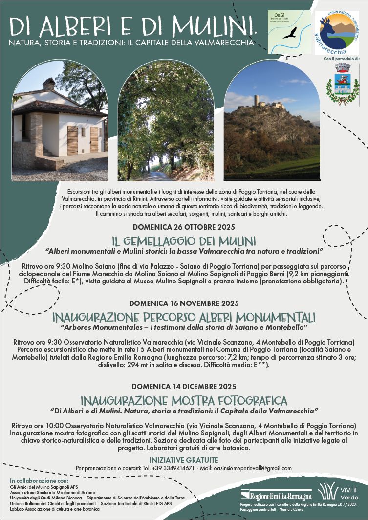 3) MOSTRA FOTOGRAFICA Le passeggiate effettuate saranno oggetto di una mostra fotografica: i partecipanti potranno inviare le foto degli alberi monumentali, dei mulini, delle evidenze storico-naturalistiche trovate sui percorsi e delle esperienze che hanno fatto partecipando alle attività proposte. Alcune delle foto selezionate saranno stampate e messe in mostra (insieme ad immagini storiche, legate alle tradizioni del territorio e naturalistiche) presso l’Osservatorio Naturalistico Valmarecchia a Montebello di Poggio Torriana (RN) creando il terzo segmento del Progetto, quello documentale. All’inaugurazione della mostra, prevista domenica 14 dicembre 2025, saranno invitate le autorità civili e religiose e tutti i soggetti che hanno partecipato e collaborato al Progetto.